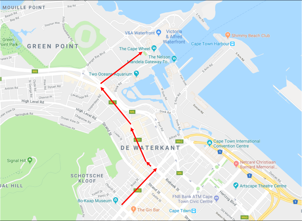 Directions: From the Bo-Kaap neighborhood, take a left on Buitengracht Street. Turn left on Somerset Road. Turn right at Portswood Road and continue.