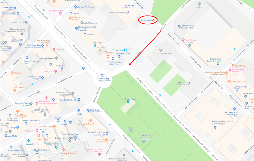 Directions: Take the L1 subway line to Arc de Triomf. Go right and walk on Av. de Vilanova.