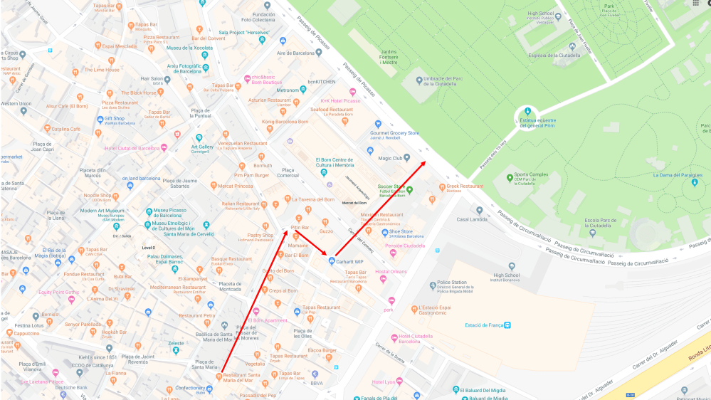 Directions: Take Carrer de Trafalgar. Turn left on Carrer de Lluís el Piadós.