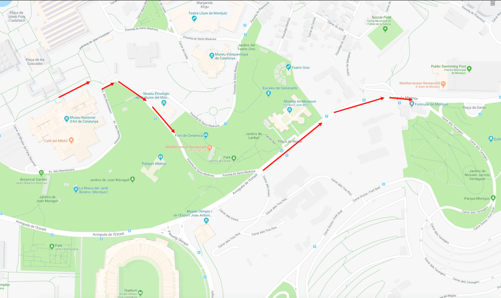 Directions: Facing the Palau Nacional, turn left. Pass the park and turn right on Av. dels Montanyans (after the park, not before). This turns into Passeig de Santa Madrona (be sure to take the Passeig de Santa Madrona that is a continuation and not the one that turns left). Turn left on Avinguda Miramar. Arrive at the Funicular de Montjuic and take this to the castle.