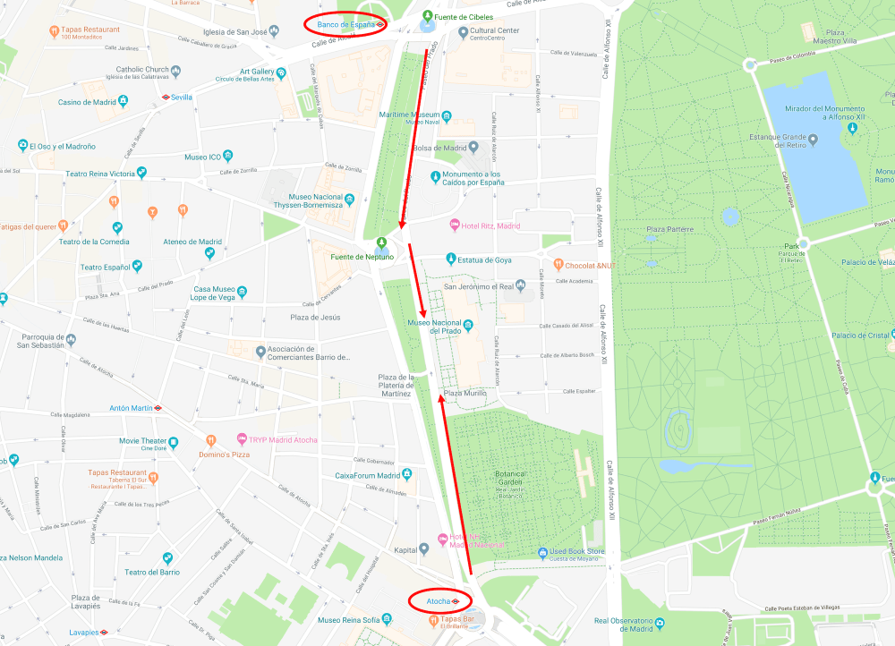 Directions: From the church, turn right on Calle Ruiz de Alarcón. Turn left on Calle de Montalbán. Turn right on Paseo del Prado.