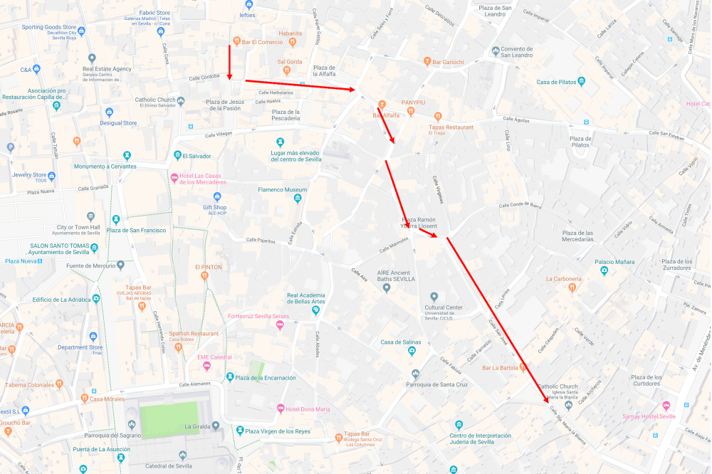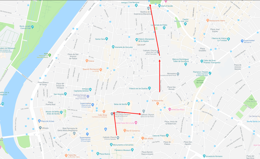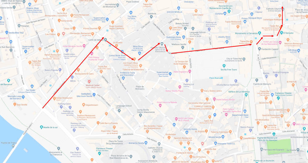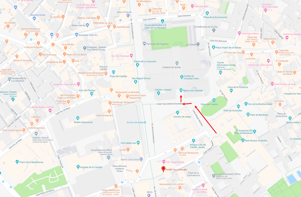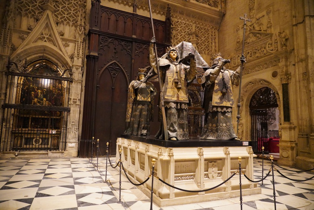 The Cathedral of Saint Mary of the See, better known as Seville Cathedral, is the third-largest church in the world as well as the largest Gothic church. After its completion in the early 16th century, Seville Cathedral supplanted Hagia Sophia as the largest cathedral in the world, a title the Byzantine church had held for nearly a thousand years. The total area occupied by the building is 23,500 square meters. Since the world’s two largest churches (the Basilica of the National Shrine of Our Lady of Aparecida and St. Peter’s Basilica) are not the seats of bishops, Seville Cathedral is still the largest cathedral in the world. Seville Cathedral was the site of the baptism of Infant Juan of Aragon in 1478, only son of the Catholic Monarchs Ferdinand II of Aragon and Isabella I of Castile. Its royal chapel holds the remains of the city’s conqueror Ferdinand III of Castile, his son and heir Alfonso the Wise and their descendant king Peter the Cruel. Christopher Columbus and his son Diego are also buried in the cathedral.